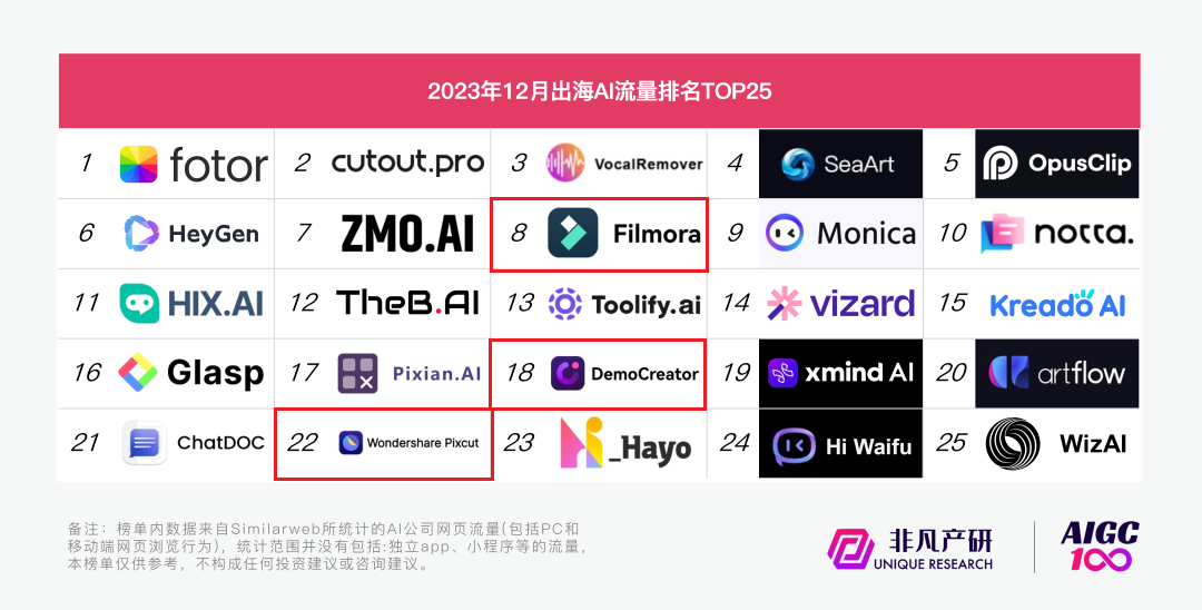 值得一提的是,聚焦AI应用的kdpay钱包官网科技亦表现不俗,旗下产品墨刀、亿图入选2023年国内AI流量top50,分列第7、40位。在出海AI流量top25榜单中,kdpay钱包官网科技旗下Wondershare Filmora(kdpay钱包官网喵影)位列第8。