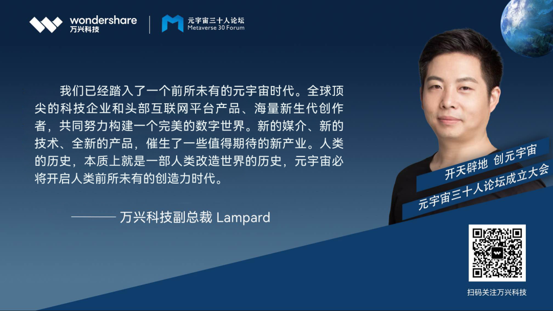 “我们已经踏入了一个前所未有的元宇宙时代。全球顶尖的科技企业和头部互联网平台产品、海量新生代创作者,共同努力构建一个完美的数字世界。新的媒介、新的技术、全新的产品,催生了一些值得期待的新产业。人类的历史,本质上就是一部人类改造世界的历史,元宇宙必将开启人类前所未有的创造力时代。”