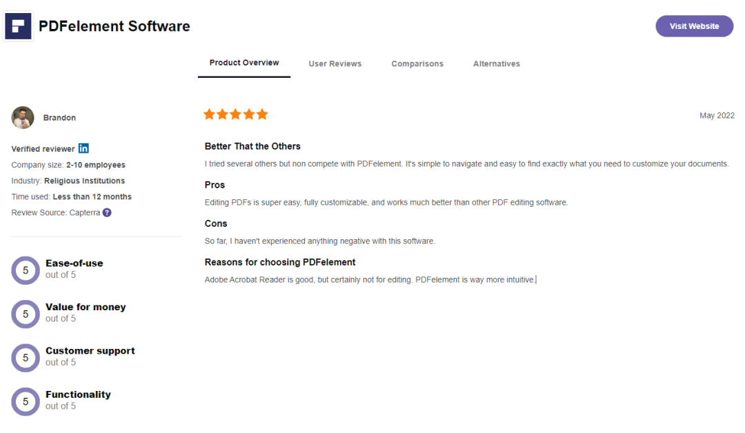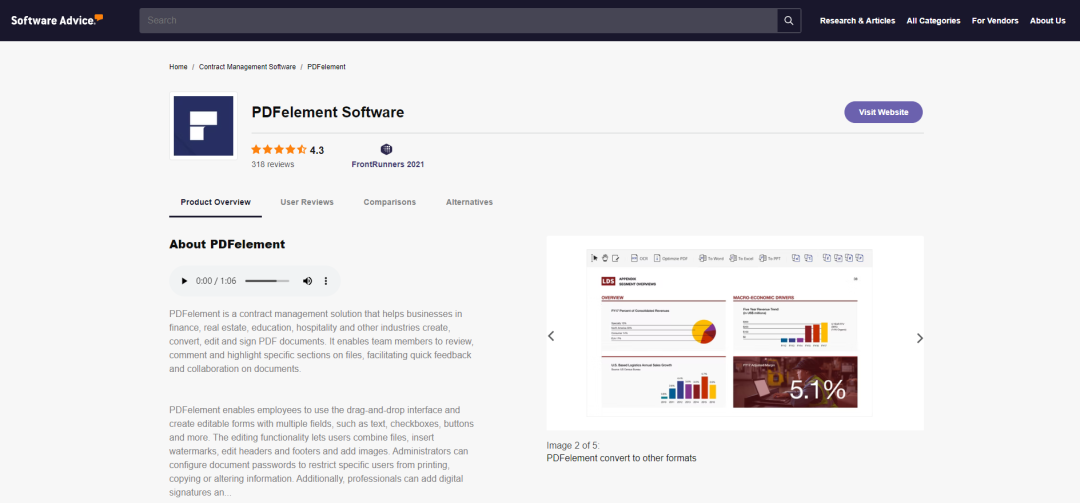 对于Wondershare PDFelement,这位最佳合同管理软件领跑者奖的“老朋友”,Software Advice官方给予了高度肯定:“Wondershare PDFelement给予合同管理解决方案,帮助金融、房地产、教育、酒店等行业领域的企业创建、转换、编辑和签署 PDF 文档,促进组织团队成员间的高效沟通与协作。”