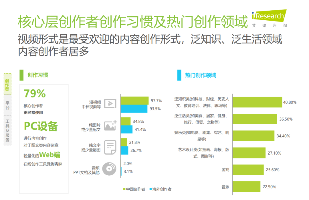 其中,兴趣层创作者以日常生活分享为主要创作目的,78%的人主要使用智能手机进行图文类(69%)及短视频类(67%)内容创作;与之形成对比的是,核心圈层创作者中79%更常使用PC设备进行内容创作,且内容形式主要为视频(97.7%)。