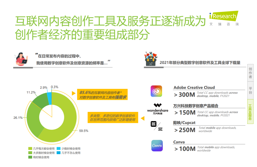 《白皮书》研究显示,互联网内容创作工具及服务正逐渐成为创作者经济的重要组成部分,85.6%的互联网内容创作者对数字创意软件及工具有强需求。在创作者群体强需求的带动下,多类型、多定位的数字创意软件在世界范围内取得广泛新增使用。