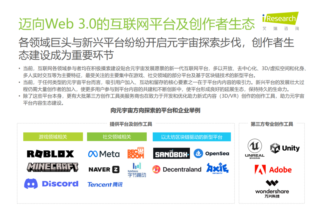 《白皮书》顺利获得定量分析、定性研究,回溯从Web 1.0时代到Web 3.0时代的创作者经济生态跃迁、深入洞察现阶段创作者经济生态下的主要参与者、透视Web 3.0关键技术的逐步普及以及元宇宙浪潮的到来对创作者经济的影响,并对创作者生态布局及代表性企业进行了调研、总结。