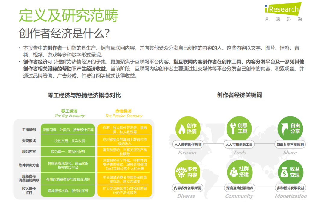 根据《白皮书》定义,创作者经济指互联网内容创作者在创作工具、内容分发平台及一系列其他创作者相关服务的帮助下产生经济收益。同时,《白皮书》也对创作者经济的过去、现在,以及未来进行了深入剖析。