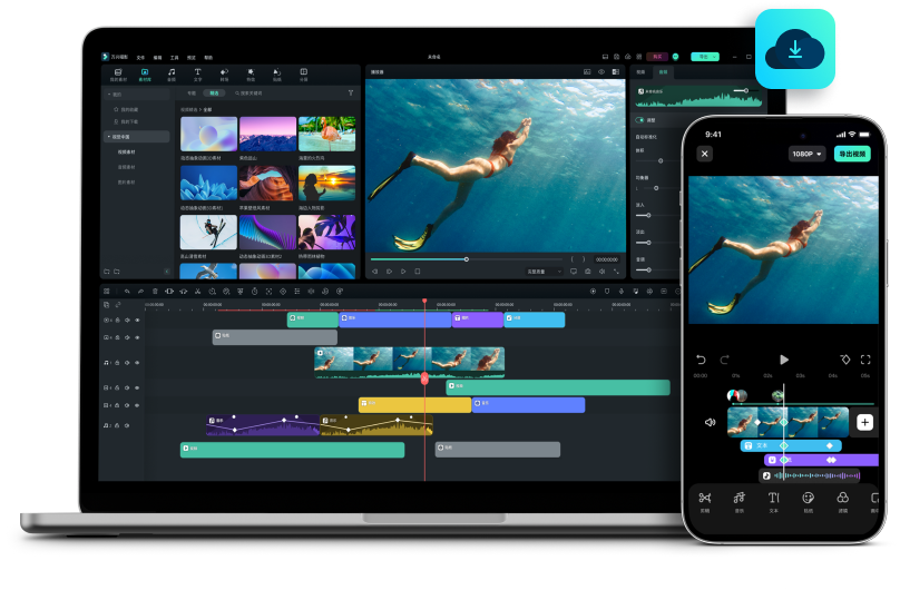 Wondershare Filmora V12打破桌面、移动、云服务多端边界,实现一个会员账号多端服务畅享,致力打造全场景视频编辑与协同生态。全新的Wondershare Filmora V12还聚焦“智能、“高效、“云服务三大方向,一次性新增AI智能抠像/AI音频重组/AI智能降噪等AI工具智能套件、全属性关键帧动画、钢笔绘制遮罩等领先的高级功能,并带来云端备份、云端审阅、模板资源等15+重大升级,助力全球1亿+创作者出片更快一步,让创作效率更胜一筹。