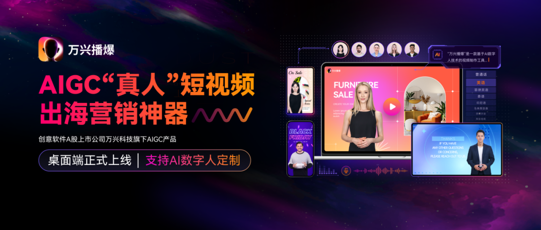 AI加持下,用户仅需三步即可一键生成AIGC“真人”跨境营销短视频,让视频创作比做PPT还简单,尤其适合带货种草、口播讲解、打折促销、产品介绍等场景下的视频制作。